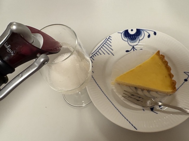 このチーズタルトを食べるとき、紅茶でもコーヒーでもなく、私はシャンパーニュ。