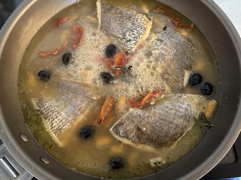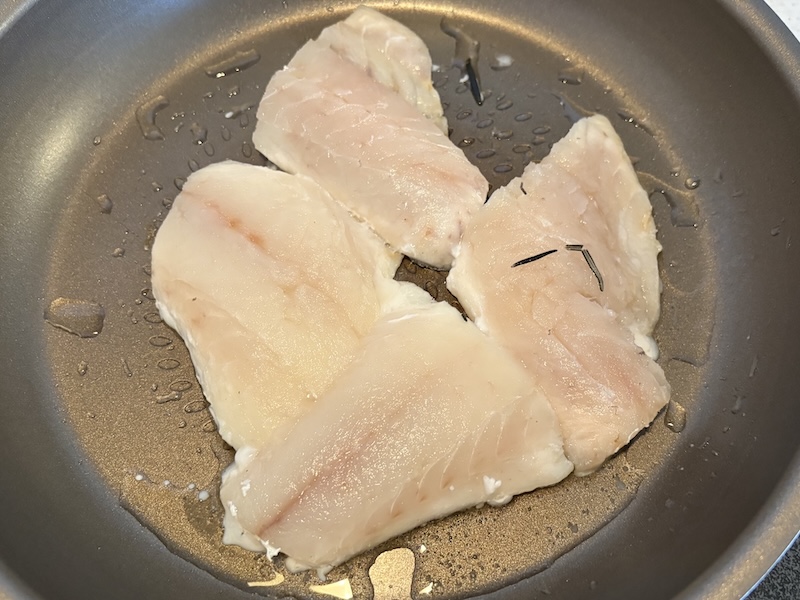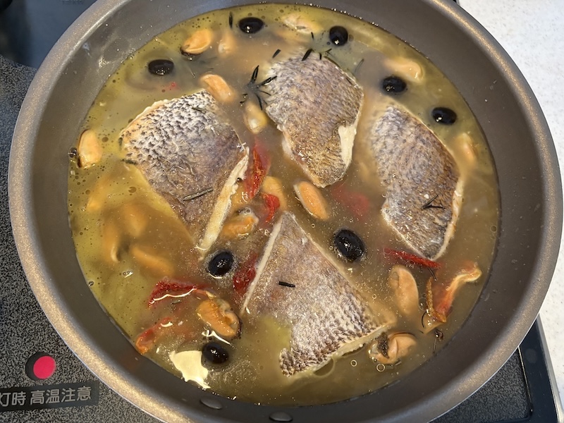 解凍した鯛をオリーブオイルで軽く焼き目をつけ、